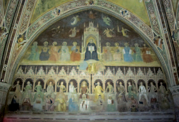 Andrea da Firenze, Le Triomphe de saint Thomas d’Aquin. Au centre de la fresque, auxpieds du Doctor angelicus, trois « hérétiques » : Arius, Sabellius et Anerroës.Fresque dans la Chapelle des Espagnols de l’église Santa Maria Novella de Florence. Photo © CC, Wikimedia.org